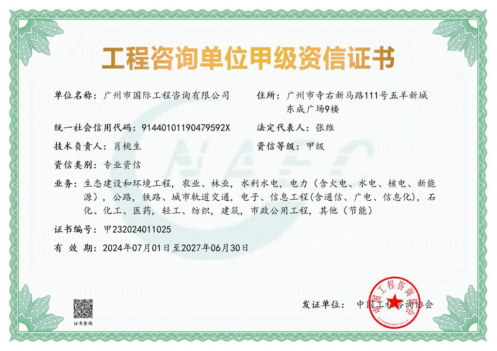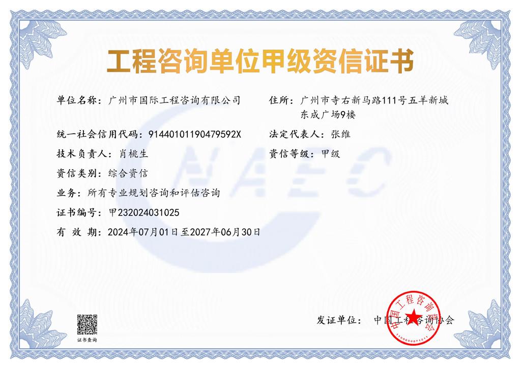 工程咨詢單位甲級(jí)資信證書(綜合資信)