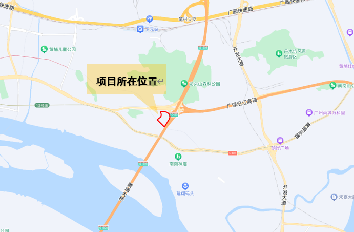 本項(xiàng)目位于廣州市黃埔區(qū)紅山街道廣州冶煉廠地塊,廣深沿江高速與廣澳高速交叉口西南處。