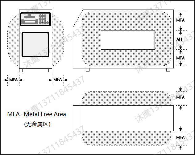金屬探測器的電磁信號場一般位于探測頭隔離或防護好的內(nèi)部,但是電磁信號會有一定的發(fā)散性,所以在檢測通道兩側(cè)會存在一個“無金屬區(qū)”。通常當金屬探測器頻率為低頻小于200KHz時,“無金屬區(qū)”約等于檢測通道高度的尺寸;當金屬探測器頻率為高頻時,“無金屬區(qū)”約等于檢測通道高度的1.5倍。該區(qū)域不允許存在金屬。