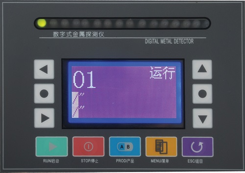 指示燈 從左起,第一個燈為運行指示燈。正常探測時,該燈為綠色。第二個燈為NG指示燈,當(dāng)探測到金屬異物時,該燈為紅色。其余燈為等級顯示LED,顯示金屬成份探測等級。
